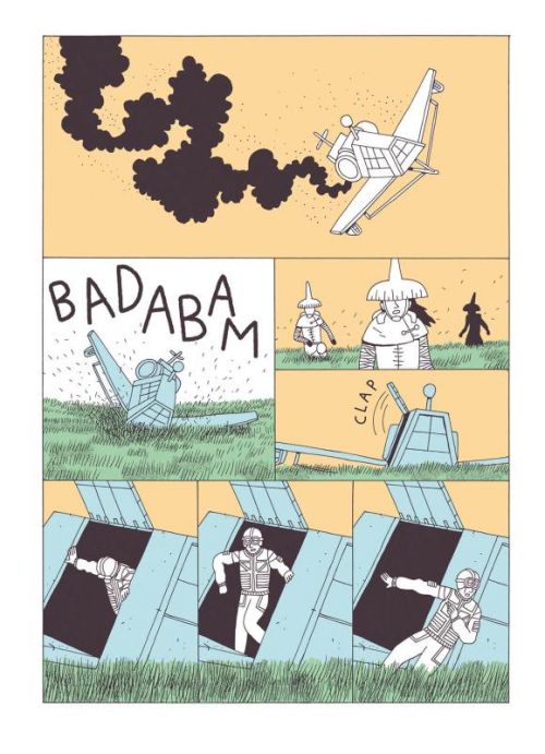 Cette aventure imaginaire, aux frontières de la science-fiction et de l’anthropologie, est parfaitement en phase avec le catalogue des éditions 2024. Jeremy Perrodeau, l’auteur de Crépuscule et de Le long des ruines, reprend sa thématique de prédilection : les ruines d’une civilisation différente et si proche à la fois de la nôtre. Autre base analogue à ses précédentes œuvres : un agent « s’échoue » en ce lieu contrôlé par un peuple plus archaïque que le sien, en marge d’un empire que nous ne verrons jamais. Il s’immerge alors dans les rites, tente d’en comprendre la culture et surtout, joue les espions infiltrés pour tenter de percer le secret d’artefacts protégés par le dogme religieux en place. Le récit est riche en paraboles, notamment sur le culte que nous vouons à nos antiquités, voulues fondatrices de nos propres civilisations et auxquelles on accorde généralement une adoration disproportionnée. Cet axe est similaire au veau d’or dans l’exode des hébreux emmenés par Moïse (Premier testament). Mais en marge de ce propos et de la grande cohérence d’une civilisation imaginée de toutes pièces (dont en sent les inspirations venues d’Asie et d’Océanie), on ne voit pas très bien où veut nous emmener l’auteur. Au cours du parcours initiatique et linéaire de son héros infiltré, Perrodeau nous abandonne sur une fin énigmatique et ouverte. Un peu facile ? Le dessin stylisé est en revanche bien en place, très dépaysant dans ses vues panoramiques… mais complété par un système de colorisation terne, en 2 ou 3 teintes (jamais plus) fades en aplats qui écrase un peu les profondeurs.