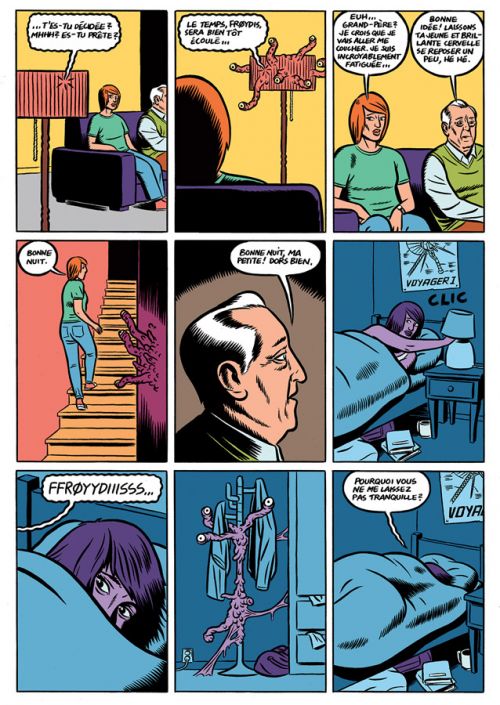 Sur le plan graphique, le trait encré épais, les masses noires profondes, la colorisation en aplats, le contexte contemporain et le focus sur l’adolescence malsaine font inévitablement penser à « l’école Charles Burns ». Le danois Kristian Hammerstad s’avoue néanmoins plus volontiers inspiré par les films de John Carpenter, le cinéma de genre de série B, avec une fascination pour les monstres kitchs issus de la culture pop-underground du milieu du XXème siècle. Cette définition est à peu près au point pour qualifier ce Creep traduit et édité par les éditions Aaarg!, dans le domaine trash-gore décalé qu’ils affectionnent. Le fil narratif de Creep additionne en réalité trois histoires de monstres, indépendantes et juste reliées entre elles selon le principe de souvenirs étudiants évoqués. Chacune d’elle est parfaitement glauque et/ou gluante et/ou malsaine, sans jamais tomber dans l’écueil du vulgaire. Sur un découpage en gaufrier strict de 9 cases par planche, les cadrages et les mises en scène d’Hammerstad ne cherchent pas précisément à susciter le frisson, mais plutôt le malaise. Des gros plans sur des insectes écrabouillés, des pustules ou une sudation exacerbée suffisent généralement. La lecture de cet album s’accompagnera aisément d’un yaourt périmé, d’un pétard coupé au cirage et d’un fond d’alcool frelaté trouvé au fond du placard de grand-papy.