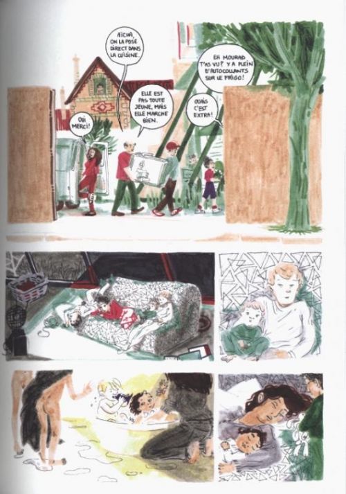 Longtemps avant d’écrire le polar Trait Bleu (à fort succès critique et public), le scénariste Jacques Bablon avait scénarisé chez Casterman (A suivre) une trilogie policière hard-boiled sous le pseudo de Violeff (dans les années 80). Bien loin de ce registre, il scénarise ici pour Edith Chambon une curieuse chronique familiale brouillant tous les codes sur l’éducation et les liens fraternels. Chambon persiste donc dans un domaine qu’elle maîtrise, elle qui a dessiné pour Gép et les éditions Mouck des chroniques sociales cernant les comportements des djeunz dans notre époque. Le one-shot de la scène BD « indé » qui résulte de leur association n’est pourtant pas toujours facile à appréhender. La narration se permet des ellipses de longueurs inégales, les membres de la fratrie n’ont pas toujours des traits de visages qui les distinguent les uns des autres, le découpage des cases et l’enchainement séquentiel se moquent des codes standards de la BD… Sans oublier le dessin au style original, entièrement réalisé aux feutres de couleurs et quelques traits noirs fins, se détachant sur un blanc de page omniprésent. La technique graphique, le choix de narration distanciée et morcelée, ainsi que le rythme des séquences produites, se montrent toutefois intéressants, pour qui cherche la nouveauté en matière de 9ème art et fait l’effort de la concentration nécessaire. A force d’aller-retours, on finit par correctement composer ce qu’il se passe au fil du temps dans cette famille non-conventionnelle. Car si les 6 enfants ont certes les deux mêmes parents, cette famille brouille tous les préconçus : la moitié a un morphotype arabe, l’autre polonais. Les 6 enfants ont des personnalités différentes auxquelles on s’attache, donc, différemment – à l’exception de Gilles, qui semble bien candidater au djihad… bien que son cas reste flou à dessein et que l’époque du livre s’achève en 1996. Leurs particularités individuelles et leur vie de bohème leur vaut logiquement d’être stigmatisés et haïs par le voisinage. L’écho logique du racisme inhérent à notre époque ? L’organisation familiale et l’auto-éducation qui en découle sont assurément les premiers propos de fond de ce one-shot à la marge, dont chacun retirera les enseignements qu’il veut…