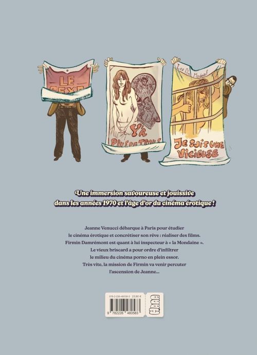 Une fois passé son titre très subtil, il est autorisé de s’interroger sur le public cible concerné par cette histoire du film érotique / pornographique au tournant des années 1974-75. Les plus vieux lecteurs se souviendront peut-être qu’avec l’arrivée de Giscard à la présidence de la République française, un vent de liberté a rapidement soufflé sur le porno – avant de retomber en demie molle. Le rajeunissement de la majorité à 18 ans, la promesse d’une libéralisation des mœurs et de l’encadrement législatif des œuvres classées X a finalement abouti à la mise en place d’autres critères. Or Kris et sa compagne Swann Dupont ne racontent pas précisément ici une histoire politique, mais bien une histoire de mœurs, un peu futile et pleine de bons mots, en marge de cet encadrement… sans érotisme ni pornographie ! Et c’est bien là le tour de force de ce (trop ?) long album, qui parle en toute liberté et avec légèreté du milieu du porno sans jamais montrer la moindre partie génitale. Sous les crayons semi-réalistes et stylisés d’Eliot, un flic un peu « vieille France » infiltre le milieu du porno et finit par se prendre au jeu. Il côtoie une jeune cinéaste moderne, intéressée intellectuellement par le porno – et ouais ! – et leurs destinés croisées finissent par déterminer la vraie tendresse qui se trouve forcément dans l’acte d’amour, qu’il soit rémunéré ou pas. C’est gentiment léger, sans tabou, un peu marrant et empli d’une belle masse de contre-culture. Un dossier pédagogique final revient en détail sur cette période charnière.