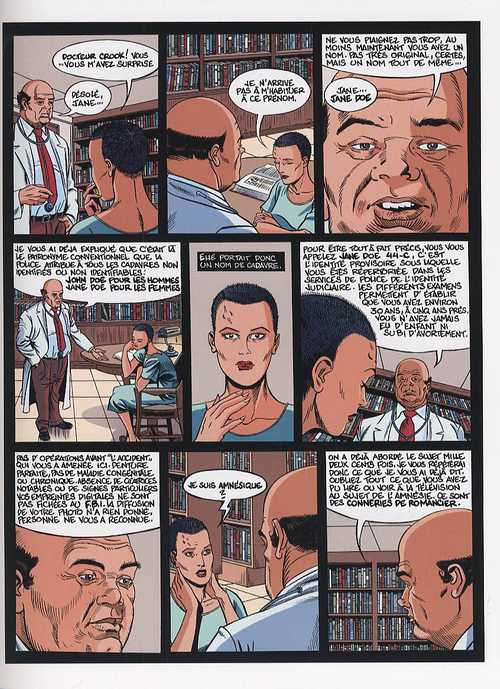 On connaissait l’amnésique, incarné par XIII, remuant ciel et terre pour retrouver ses souvenirs. On a pu découvrir plus récemment, dans le Jour des Magiciens, le cas d’une jeune fille seule à avoir conservé la mémoire dans un monde d’amnésiques. Voici Jane Doe, au cerveau effacé et donc sans passé. Le thème de la perte de la mémoire passionne les auteurs de BD. Et heureusement pour nous, le sujet semble les inspirer ! Au scénario, Philippe Brussolo adapte son propre roman paru aux éditions du Masque en 1996. Servie par une écriture intelligente, au style précis et direct, l’intrigue fonctionne parfaitement. Les dialogues de cet écrivain bardé de prix littéraires, sonnent justes. Les mots sont choisis avec un soin minutieux et apportent une grande précision à la narration. Enfin, Gérard Goffaux prête un graphisme très américain à cet édifice, assurant par là une lecture facile et fluide. On ne connaît pas encore la vie de Jane Doe, mais elle mérite déjà qu’on s’y attarde.