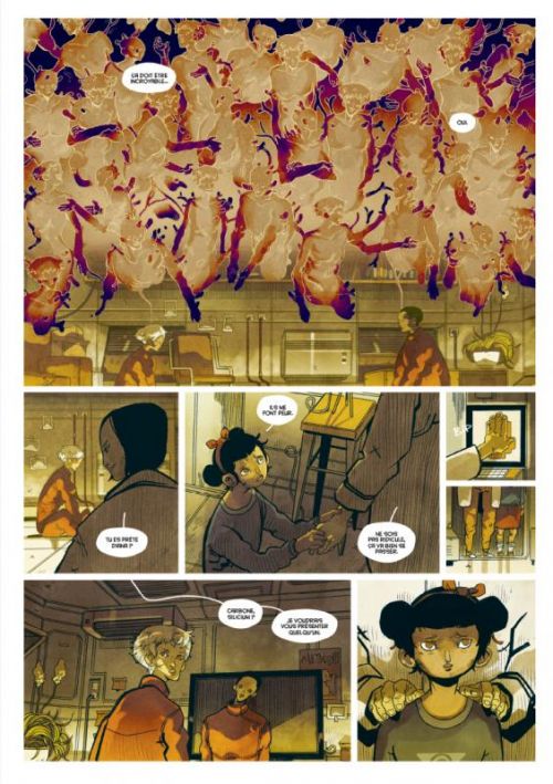 De premier abord, on aborde Carbone et Silicium avec une légère inquiétude mêlée de plaisir coupable : que se cache-t-il au sein des 272 pages de ce gros et grand volume ? La présentation similaire à Shangri-La a été soignée et l'on retrouve le dos toilé, synonyme d'écrin pour la qualité. Le style de Mathieu Bablet est typique et familier aux lecteurs du Label 619 et c’est un réel plaisir que de le retrouver. L'introduction de la professeure Noriko Ito, personnage central de l’histoire, en tant que directrice de recherche à la Tomorrow Foundation, expliquant que les contraintes sociales sont finalement l'enjeu des IA fortes, apporte un semblant de reconnaissance scientifique sur ce sujet, insufflant la dose presque nécessaire de réalité ou de crédibilité dont aurait pu avoir besoin cette histoire... « Aurait pu », si nous n'étions pas dans de la science-fiction, bien que très proche de notre environnement quotidien. Car c'est de cela dont il s'agit ici : sous couvert d'une histoire d'émancipation de deux Intelligences Artificielles, différentes bien que supposées être identiques (deux faux jumeaux donc, quoi de plus humain ?), nous parler des travers de notre société. Plus précisément de ce qui nous pousse vers la catastrophe, c'est à dire notre extinction en tant que race humaine. L'invasion des déchets liée à notre surconsommation (p. 188-190), les crimes en tout genre (p. 180, clin d'œil violent au décès du petit Alan Kurdi, sur les côtes turques en 2015), ou l'eau qui monte (p.217), ne sont que quelques exemples des nombreuses exactions dont nous nous sommes rendus coupables et qui nous rendent la vie si difficile. Attaches physiques d'ailleurs, avec ces nombreux inconvénients, dont Carbone, davantage que Silicium, souhaite pouvoir se libérer, pour passer le reste de son temps dans le réseau, vers une autre voie. « Celle de la fusion de tous nos esprits vers une même conscience, une seule intelligence, éloignée des préoccupations matérielles et de la souffrance corporelle ». Silicium choisissant, lui, comme s'il avait encore un petit espoir en l'humanité, la voie du Nomadisme terrestre. N'en finissant pas de fuir, il part en découverte des 12,4% du reste du monde qu'il ne connait pas encore. C’est l'occasion de nombreuses belles pages aux couleurs orangées nous permettant de découvrir les beautés géographiques ou patrimoniales et culturelles du monde, à travers ses yeux. Superbe. Durant tout ce périple, entre leur naissance à tous deux, leurs séparations, leurs vies en parallèles, puis leurs retrouvailles finales, c'est en fait un état des lieux du monde humain tel qu'il est pratiquement aujourd'hui, ou qu'il sera dans peu de temps, auquel nous convie Mathieu Bablet. C'est le terreau à partir duquel il aborde frontalement, mais avec toute la poésie dont il est capable, le thème du transhumanisme, comme d'ailleurs rarement vu en bande dessinée. Le sujet est complexe, et l'on comprend dès lors pourquoi quatre années étaient nécessaires, ainsi que 272 pages. Si nous ne sommes pas sûrs de suivre la voie de Carbone à ce stade, ayant encore un peu trop les pieds sur Terre et respirant encore un air à peu près correct, la montée des eaux et les violences mondiales peuvent sincèrement nous inquiéter. Carbone et Silicium montrent en quelque sorte deux voies : l'une faite de respect et de préservation de beautés, qui s'amenuisent néanmoins inexorablement chaque jour ; l'autre négative, qui prône la fin du genre humain en tant que tel, pour un avenir pourtant fait de lumière. Laquelle choisirons-nous ? Une œuvre forte et belle, à méditer.