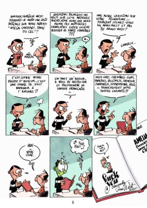 L’exercice de la dédicace pour un auteur de bande dessinée est souvent propice à des situations cocasses. Dans ce recueil de gags d’une planche, pour la majeure partie d’entre eux, le dessinateur Arnü West se met en scène en étant derrière une table pour rencontrer son public. Le moins que l’on puisse dire c’est que les personnes qui sollicitent une dédicace sont singulières, pénibles, sans-gêne ou ne maîtrisent pas toujours l’art du compliment. Arnü lui non plus n’est pas toujours tendre avec son public et l’exercice promotionnel peut également virer au fiasco. Arnü évoque également d’autres situations farfelues de son quotidien de dessinateur. C’est un humour bon enfant essentiellement fait d’autodérision qu'il pratique ici. Cet album BD ressence aussi les planches de gags qu’Arnü West réalisait pour le mensuel BD L’immanquable (dernier numéro en 2023). Il y met en scène un lecteur lambda, l’immanquablecteur, un fidèle parmi les fidèles qui ne louperait pour rien au monde la sortie de son magazine. Sorti du contexte de la publication, l’intérêt de ces planches est assez limité. Graphiquement c’est très sobre, assez proche du dessin de presse avec un trait spontané, pas très élaboré et une colorisation rapide.