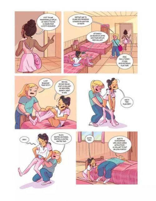 Cette nouvelle série pour les jeunes adolescent-es de Maurizia Rubino et Muriel Zürcher s'articule autour du thème de la danse. Nul doute que le sujet séduira les lecteurs (et surtout les lectrices), car les ouvrages sur la danse sont toujours très demandés par le jeune public. Lisette intègre un programme qui permet de sélectionner les futurs élèves d'une école de danse. Complexée par ses rondeurs, mais passionnée par cette discipline, elle trouve la motivation avec son amie Margaux. Ensemble, elles se lancent le défi de réussir. La compétition s'annonce rude, mais les deux filles vont faire des rencontres qui vont les pousser à se surpasser. Graphiquement, cela est annoncé dès la couverture, l'univers est très girly. Le rose est de rigueur et les personnages centraux sont principalement féminins. Tant par le sujet, que dans son traitement, il sera plus difficile pour le lectorat masculin de se tourner vers ce type d'ouvrage... C'est dommage, car l'album véhicule une notion d'inclusivité, par rapport au corps. Il aurait pu être traité de façon plus élargie, plus neutre pour toucher un plus large public. On sent aussi que la dessinatrice s'est fait plaisir, notamment dans les décors. Mais parfois, c'est too much : pourquoi les espaces sont-ils si gigantesques pour une simple audition de danse d'adolescents ? Le scénario est très classique, sans surprise et prévisible : tout est bien qui finit bien. Ce premier tome lance une nouvelle série autour du thème de la danse et s'adresse aux pré-adolescent(e)s.