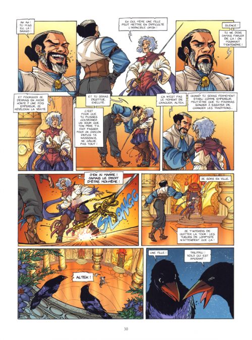 Pour sa nouvelle série, Arleston propose un point de départ assez classique : un duo d’enfants doit faire face à un perfide oncle tentant de les éliminer, avant que l’ainé n’accède au trône. Une sorte d’Iznogoud en plus sanguinaire, en somme. Là où l’aventure devient plus originale, c’est lorsque cette intrigue est perturbée par le ralentissement de la rotation du monde, ce qui rallonge les journées et les nuits. C'est terrible : le monde risque, à terme, de s’arrêter totalement, laissant certaines régions dans le noir ou dans la lumière de manière définitive. Entre un univers assez riche et une intrigue très originale, cette première partie est aussi prenante qu’agréable, malgré quelques défauts. Ainsi, certains dialogues semblent plus s’adresser aux lecteurs qu’aux protagonistes et manquent donc de crédibilité. Par exemple, on ne saisit pas encore très bien l’intérêt de ces deux corbeaux qui parlent à la manière des oiseaux du Royaume de Benoit Feroumont, l’humour et les interactions avec les humains en moins. Rien qui n’entache cependant cet excellent premier tome mis en images par Dana Dimat et en couleurs par Florence Torta. La dessinatrice collabore déjà avec le scénariste sur la série des Elfes noirs chez Soleil. Elle propose ici un style différent, mais néanmoins très réussi, en mélangeant fantasy, steampunk et conte onirique. Les couleurs punchy renforcent l’ensemble de fort belle manière. Une belle surprise à découvrir au plus vite…