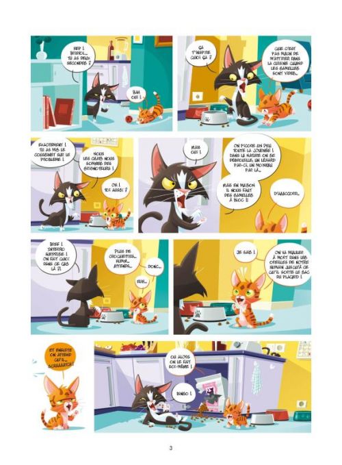 Le maître de deux chats décide d'adopter encore un troisième chaton. Celui-ci a tout à découvrir, et les deux vieux matous qui vivent en ces lieux ont bien l'intention de l'éduquer, de lui donner tout un tas de conseils pour faire tourner en bourrique leur maître adoré. Si le nouveau-venu réussit à attraper une souris, il peut la ramener dans la maison pour l'échanger contre un morceau de viande, par exemple. Certes, son maître n'arrive toujours pas à comprendre cette monnaie d'échange. Par contre... il peut user de son arme fatale : le ronron, qui rend tous les humains accros, en déclenchant chez eux les hormones du bonheur. S'il a faim et qu'il n'y a plus de croquettes ? Il peut aller se servir directement dans le paquet. Il monte aussi régulièrement en hauteur pour dominer son territoire et avoir une vue d'ensemble. Leur maître a aussi acheté tout un tas de griffoirs, mais les deux vieux matous préviennent le jeune chaton : le plus efficace, ça reste quand même le canapé.