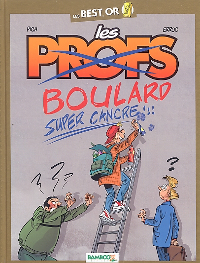 Symptôme d'une série grand public qui peine à trouver son second souffle, Bamboo sort le deuxième tome Best-Or de la série des Profs, compilation de quelques moments de la série-mère. Mais si les profs et les auteurs fatiguent, ce n'est pas le cas, en revanche, du plus grand boulet scolaire que la Terre ait enfanté : Thierry Boulard, caricature du cancre désinvolte et exaspérant, véritable cauchemar des profs avec ses éternels 2/20, ses retards intempestifs et son sens de la répartie imparable ! Populaire, cancre et fier de l'être, le trait est à peine grossi... Sous la forme de gag-planches parfois bien sentis et à peine éloignés de la réalité, les situations donnent à voir un Boulard tour à tour moqueur, provocateur, ignare et même nostalgique des mauvaises notes ou tics de profs. Parce qu'un Boulard sans profs pour lui rappeler quelques règles de bon sens et un prof orphelin de son petit Boulard, ce serait forcément moins drôle. On s'amuse et on sourit plus qu'on ne rit franchement à la lecture de ce recueil de situations scolaires loufoques, même si les gags, portés par un dessin à la fois simple et vif, remplissent leur contrat... Elèves, profs ou adultes nostalgiques, tous pourront se reconnaître dans cette BD qui, encore une fois, loin d'être essentielle, constitue néanmoins une petite récré divertissante... mais guère plus. Donc rien de nouveau au pays des Profs.