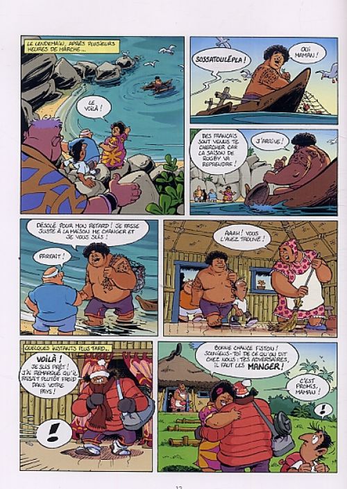 A quelques semaines du championnat du monde de rugby en Nouvelle Zélande (septembre 2011), voilà le 9ème tome de cette série que Poupard (dessin) et Beka (Scénario) publient chez Bamboo, la maison d’édition spécialisée dans les séries humoristiques à thèmes. Dans cette BD, on retrouve les grandes caractéristiques qui font l’esprit du rugby : le fair-play, les troisièmes mi-temps, des rapports virils sur le terrain, etc. Le risque à vouloir se montrer caricatural, c’est que l’on peut tomber dans l’excès (le joueur de rugby qui pense que les habitants des atolls du Pacifique sont encore de sauvages cannibales ; le troisième enfant de la famille fidjienne qui, quelque soit son sexe, s’occupe de la maison, est affublé d’une tenue de femme de ménage, etc.). Cette série, qui connaît un réel succès d’édition ne s’adresse pas nécessairement aux amateurs du 9ème art, mais vise un public beaucoup plus large, qui ne lit que très ponctuellement de la BD. Il concerne aussi bien entendu les initiés du rugby qui peuvent parfois reconnaître des personnages hauts en couleur de ce sport. Ces derniers sont attachants et ont un caractère bien trempé. Les blagues manquent d’originalité, de renouveau et les chutes sont souvent prévisibles : on esquisse que bien rarement un sourire. Le dessin est quant à lui agréable, bien maîtrisé, il répond tout à fait à ce type d’univers et plaira certainement au grand public amateur de ce sport de contact.