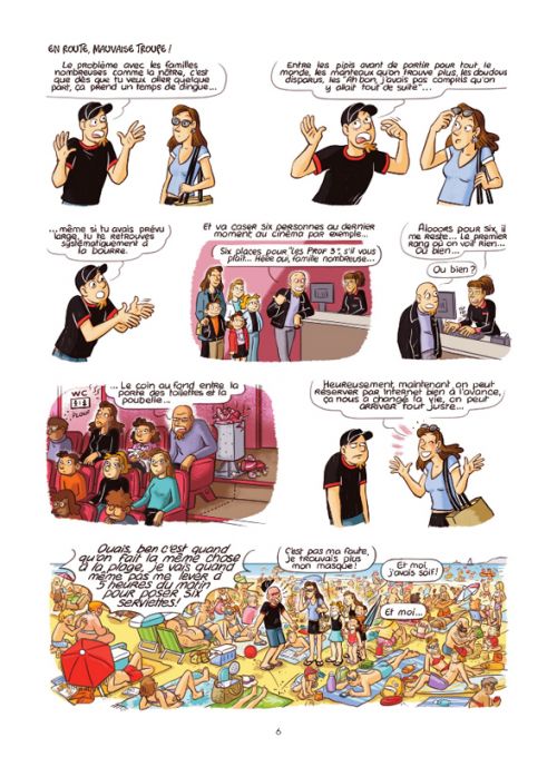 A l’instar de Boule et Bill ou des Sisters, Sti et Armelle livrent un nouveau recueil de gags domestiques du quotidien, sur un ton bon enfant et à partir d’évènements réalistes. Le pitch de la série est explicite dans son titre : vive la famille recomposée, après deux divorces respectifs. Nicolas et Sophie (deux prénoms bien standards des « quadra ») se retrouvent en effet à devoir gérer une famille de 6, lorsque tous leurs enfants et ados sont réunis. On note qu’à l’instar des deux séries cultes et modèles pré-citées, l’âge des enfants n’a pas changé par rapport au tome 1. Les personnages ne vieilliront donc pas avec leur lectorat (comme l’ont fait Lou ! et Buddy Longway, par exemple). Dès lors, les sujets d’organisation du quotidien ne manquent pas. Sti réussit le difficile exercice de la variation des situations et des ressorts finaux gentiment humoristiques. On ne rit certes jamais aux éclats, mais même si on n’appartient pas à une famille nucléaire, on s’amuse des pirouettes pragmatiques tout à fait crédibles à laquelle doivent se livrer régulièrement les deux parents. On note surtout que le scénariste ne tape jamais là où ça pourrait faire mal : les jalousies entre membres non sanguins de la fratrie. Les demi-frères et demi-sœurs s’entendent tous plutôt bien ensemble, sans le moindre motif de détestation. Au dessin, Armelle déroule une griffe artistique cohérente avec le sujet, caricaturale et limpide, complétée par des couleurs vives (persos) et douces (les arrières plans), le tout sans bordures de cases – ce qui permet la plupart du temps de s’affranchir des décors pour se concentrer sur les personnages.