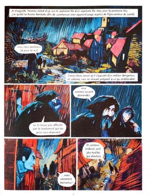 La série de romans de dark fantasy, écrits par Joseph Delaney, L'épouvanteur, ont rencontré un grand succès. Ils continuent d'être lus encore par des lecteurs adolescents, qui ont envie de frissonner. Pierre Oertel (qui a adapté en bande dessinée la série des Dragons de Nalsara) et Benjamin Bachelier (Gatsby le magnifique, Ulysse Wincoop, Le Clan des Otori) ont adapté ce best-seller en bande dessinée. Le résultat est au rendez-vous ! Le binôme réussit à retranscrire l'ambiance sombre, pesante, avec un suspens latent tout au long du récit. L'album est publié dans la collection Bande d'ados, et c'est une très bonne chose, car il n'est pas conseillé de le lire avant 12-13 ans. Benjamin Bachelier crée une atmosphère angoissante en utilisant des couleurs sombres, un trait « gras » qui laisse transpirer la matière. Et il n'hésite pas à donner des allures terrifiantes aux personnages incarnant le mal. Les lecteurs n'auront aucun mal à s'identifier au personnage principal, qui a le même âge que le public-cible, et qui découvre, en même temps que nous le monde terrifiant qui l'entoure. Jusqu'à la dernière page, le lecteur reste en apnée. Les pires scénarios se réaliseront-ils ? Cette adaptation très réussie permet une bonne entrée en matière pour découvrir les romans et prolonge la lecture de ceux-ci en matérialisant l'écrit. Un titre qu'il n'est pas conseillé de lire juste avant d'aller dormir...