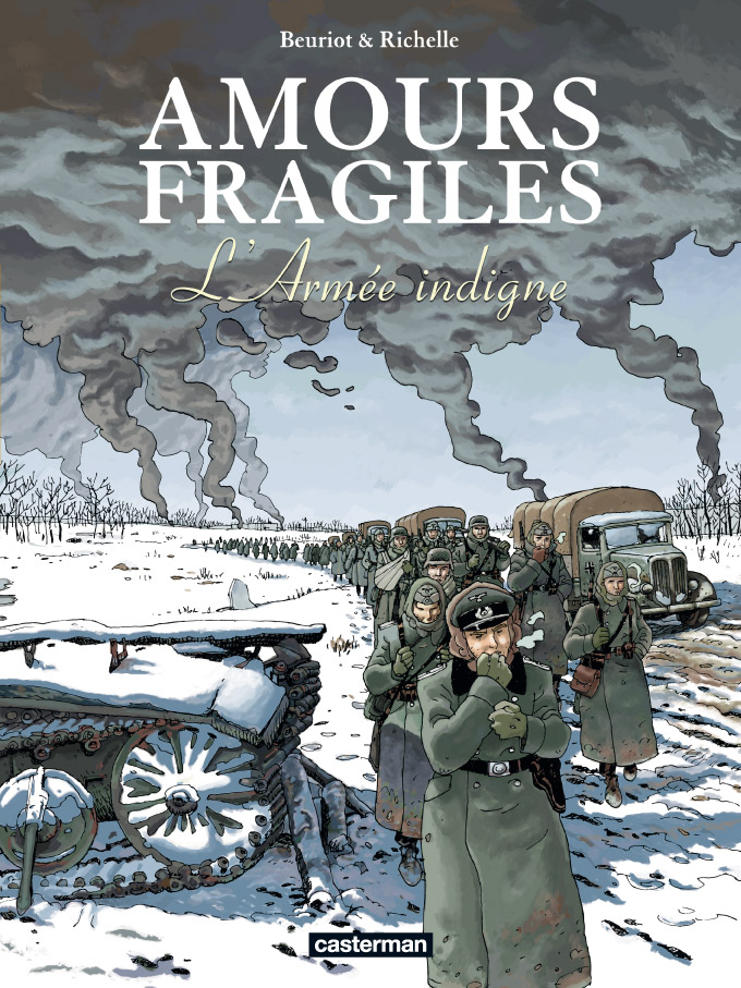 Amours Fragiles poursuit son petit bonhomme de chemin, dans ce qui est en passe de devenir une véritable fresque sur l'époque de la seconde guerre mondiale. A travers ce 6ème tome, Philippe Richelle – au scénario – aborde le sujet de l'armée indigne : la Wehrmacht qui a suivi sans trop rien dire Hitler dans sa guerre raciale finale, avec son lot de méthodes inhumaines. Nous sommes fin 1943, et la guerre fait rage, notamment sur le nouveau front de l'Est contre la Russie, dans le froid glacial de l'hiver. L'armée allemande faiblit contre la multitude des rouges. Notre héros ,Martin Mahner, a été envoyé depuis Paris sur ce nouveau front. Du coup, la romance entre lui et Katarina, qui occupait la première place pendant de nombreux tomes, passe totalement au second plan et n'est qu'évoquée dans cet album. C'est l'occasion pour le scénariste de nuancer le stéréotype d'un peuple entièrement voué à son fürher. On comprend rapidement que, à tous les niveaux, la machine commençait à grincer et beaucoup d'allemands étaient résolument contre les exactions multiples dont se rendaient coupables nazis et SS. L'ambiance hivernale d'une guerre interminable est parfaitement rendue par Jean-Michel Beuriot, au dessin. On reste dans le même style que les albums précédents, malgré les années qui passent : teintes et couleurs grisées qui renforcent la lourdeur de l'époque s'alliant parfaitement avec la galerie de personnages bien abjects mis en scène. Et on se met à espérer, pour Martin et Katarina, que des jours meilleurs arriveront bientôt !