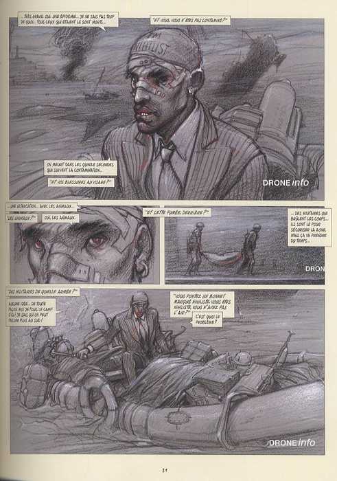 Pour cette nouvelle aventure en one-shot, Enki Bilal nous a concocté un savant cocktail de genres. Futur probable, avec la terre qui se détruit de partout à cause du climat ; western avec des personnages charismatiques qui traversent la terre en tentant de survivre ; science-fiction avec les packs de mutation que les nantis peuvent s'offrir et qui permettent de passer du règne humain à celui d'animal (et inversement) ; horreur enfin, avec une ville détenue par une famille cannibale… Ce mélange est néanmoins parfaitement maîtrisé et réussi, conférant au récit la dose de rebondissements nécessaires pour captiver le lecteur du début à la fin. Les personnages qui tentent de survire individuellement au départ, puis ensemble dans un second temps, ont tous un charisme et une psychologie particulière, qui donnent envie d’en apprendre plus. Certes le récit est un peu difficile à suivre au départ : ce dernier accumule les séquences distinctes… mais dès qu'ils se rencontrent, la question ne se pose plus et l'histoire peut débuter. Le tout est dessiné essentiellement au crayon noir et aux pastels gras, accordant un résultat bleu-gris prenant corps dans de larges cases (souvent des demi pages complètes), déstabilisant pour les non-initiés. On finit néanmoins par s'habituer assez vite à ce visuel (la Bilal’s touch) qui colle parfaitement au ton sombre de l'histoire. Un très bon album, qui s'étale en outre sur une centaine de pages, pour le plus grand plaisir des fans…