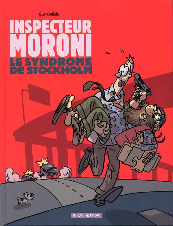 Le syndrome de Stockolm, phénomène psychiatrique connu depuis 1978, s’observe en général lors des prises d’otage. Ce symptôme se manifeste par une adhésion des victimes à la cause de leur agresseur. Toutefois, le syndrome de Stockolm dont nous parle Guy Delisle n’est pas exactement celui dont pâtissent d’ordinaire les victimes de séquestration. En réalité, si les otages se prennent de sympathie pour leur kidnappeur, ce n’est pas tant en raison du partage total de ses motivations (comme c’est ici le cas de Moroni), que d’une absolution partielle de ses actes. Ici, Moroni dans sa toute puissance intellectuelle, se fait bluffer comme un bleu et devient pleinement complice de Puthoff. Le scénario de ce troisième opus s’appuie sur le même ressort comique que celui du film La chèvre : pour mieux comprendre une pathologie, on lui affecte une pathologie similaire. Comme le personnage de l’inspecteur Moroni est à peu près aussi con que celui de Pierre Richard, la cavalcade se révèle tout aussi divertissante. Les apparitions de Vanceslas, le chien qui parle (et qui clope) sont des moments de pure dérision, tout comme les interventions télévisées de Mme Moroni mère, qui aborde devant les téléspectateurs les constipations juvéniles du fringant inspecteur…