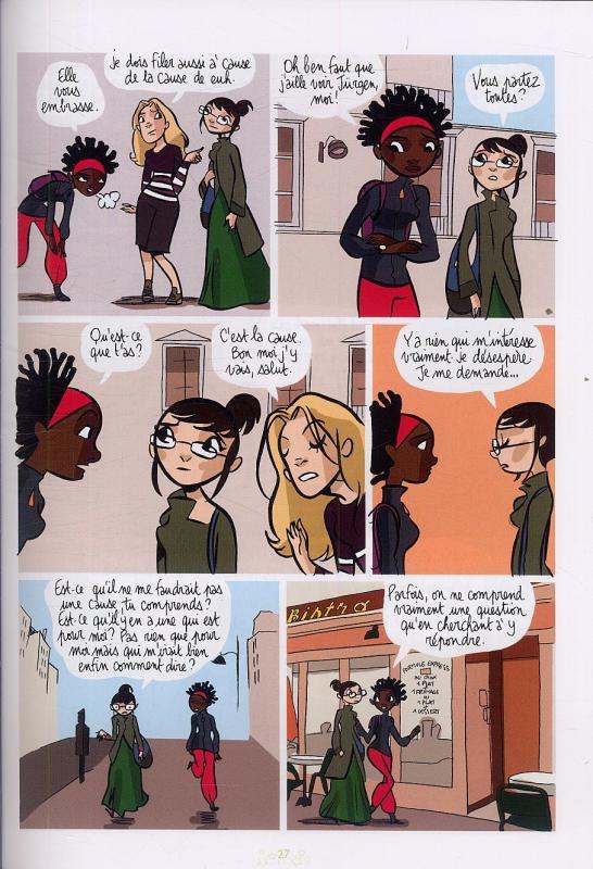 Y prendrait-on goût ? Pour être plus positif, on se contentera d’observer que ce 4e volet des aventures de nos 4 ados pétillantes se laisse agréablement apprécier… Toujours mis en place par un découpage qui focalise alternativement sur les tranchouillettes de la vie de l’une ou l’autre des quatre copines, le récit nous balade entre vie sentimentale, projets professionnels et petites futilités. Pas de grosse intrigue, d’action effrénée, de salves humoristiques pour sceller le récit. Mais un simple parfum d’authenticité qui donne au public cible une sécurisante impression de déjà vécu. Coup gagnant, donc, pour Yeuse, Noëlle, Amandine et Inaya, qui réussissent définitivement à nous rendre curieux et dont, au final, on envie l’indéfectible amitié. Sautant toujours à l’œil grâce à sa jolie couverture verte métallisée et assurant un format adéquat pour plonger, vite fait, dans un sac (à dos, à main…) l’intérieur de l’ouvrage reste un joli exercice d’esthétisme. De la colorisation soft-flashy, aux minois à croquer, tout est fait avec ce petit coté chic qui se fond parfaitement dans le propos. L’ouvrage est indéniablement à réserver à de jeunes adolescentes. Pour autant, chaque lecteur trouvera les quatre héroïnes particulièrement attachantes. Ne donnant peut-être pas une image fidèle de l’ensemble de la jeunesse mais permettant de préserver cette part de petite princesse ou de prince charmant qui dort pour toujours en chacun de nous.