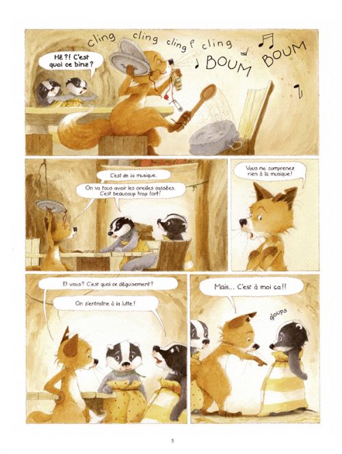 Après avoir ramassé des noisettes dans la forêt avec leurs parents Edmond et Marguerite, puis leur petite sœur Cassis, les autres enfants de la famille Blaireau-Renard sont libres de faire ce qu’ils veulent. Ils décident donc de rentrer seuls au terrier et se trouvent de suite des activités. Ainsi, Glouton et Carcajou s’enroulent dans les couvertures pour amortir les chocs de leur entrainement de lutte ; et Roussette se mets à faire de la musique : boum cling boum cling ! Ce bruit alerte les frères qui se précipitent pour faire cesser ce vacarme. Selon elle, ils ne comprennent rien à la musique ! Et eux, que font-ils avec la couverture de Roussette et celle de Cassis ? Ils n’ont pas le droit ! Ils doivent rendre ce qu’ils ont emprunté. Et que vont-ils faire maintenant ? Sans couverture, le choc de la lutte fait mal, et pas question de faire de la musique sous la pluie. Ainsi, pas facile de faire ce que l’on veut, même quand les parents ne sont pas là...