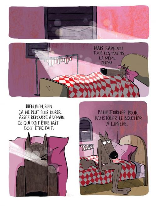 On pense initialement que cette 7ème aventure du Loup en slip va porter sur le fléau de la procrastination… Mais non, vive la procrastination ! Aujourd’hui, le loup en slip abandonne sa résolution de bricolage pour aller « voir ailleurs ». Pour la première fois au cours de ses aventures jeunesse, notre (trop) gentil (et un peu nigaud) loup porteur d’un slip blanc rayé de rouge quitte sa forêt et ses éléments rassurants. Pour la première fois, il se dit que ça peut être intéressant de voir ce qu’il y a au-delà, que ça peut être enrichissant de se nourrir d’autres cultures. Et très franchement, pas la peine d’avoir les chocottes quand on se lance dans une telle aventure, bien au contraire ! Voyager et apprendre est bien plus excitant que dangereux. Le scénariste Wilfrid Lupano invite à l’ouverture, à la découverte, à la rencontre d’autrui et il fait ainsi une sorte de relecture du mythe de la caverne de Platon. Il en profite pour focaliser sur un tout autre genre de frousse que celle de s’éloigner de son chez-soi : la peur de l’aventure sentimentale. La dessinatrice Mayana Itoiz a donc l’opportunité de dessiner d’autres ambiances que la traditionnelle forêt de feuillus : le pays visité par le loup est plus oriental, à la fois désertique et troglodyte, avec des statues marrantes (la carpe et le lapin, la grande chocotte, Hippopom le sage qui a inventé la sieste…) plus riches en enseignements que sujettes au fanatisme religieux. On retrouve quelques cases géantes et animées, pleines de détails et de protagonistes affairés à tout un tas d’occupations.