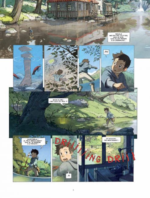 Dans un univers très proche des dessins animés de Hayao Miyazaki (Princesse Mononoké, Le château ambulant, Mon voisin Totoro...), Richard Marazano (scénario) et Christophe Ferreira (dessins et couleurs) proposent une charmante histoire directement inspirée d'un conte chinois. On découvre ici, au cœur d'un village typiquement européen, un garçon souvent délaissé, aux prises avec de curieux évènements. Un poisson d'or, un encapuchonné à la tête de crapaud, une jeune fille enfermée dans un sac en toile de jute... Autant de bizarreries que l'on découvre, avec réel plaisir, en même temps que le héros. Assez singulier, le récit se révèle efficace et embarque son lecteur du début à la fin dans la première partie de cette grande aventure (sur deux au total). Les révélations se dévoilent idéalement, au moment où d'autres mystères et questionnements apparaissent. La force du récit et son immersion découlent également de la sublime mise en image, proche de l'univers de l'excellent Miyazaki lorsque l'histoire se déroule dans notre monde, mais aussi de celui du non moins talentueux Akira Toriyama (Dragon Ball, Dr.Slump, Dragon Quest...) lorsque le héros débarque dans le monde situé de l'autre côté du lac. Bref, cette première partie s'avère concluante et réussit à nous faire voyager, qu'on soit adulte ou enfant. On est déjà impatient de découvrir la conclusion du récit lors du prochain album...