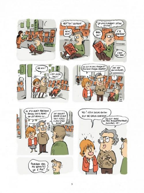 A partir de combien, est-on riche ? 4000 euros par mois, comme l'a dit un jour François Hollande ? 150 000 euros par an est-il si peu que Françoise Hardy s'en trouve contrainte à faire la manche dans le métro ? Comme le font remarquer les auteurs dans leurs premières pages, s'il existe un seuil de pauvreté, il n'existe pas de seuil de richesse. On trouve toujours plus riche que soi. Ne voyant personne au rayon sociologie de la « Fnouc », les chercheurs Monique Pinçon-Charlot et Michel Pinçon vont à la rencontre de Philippe, un lecteur insouciant assis au rayon BD. Il l'abordent en lui posant la question piège : c'est quoi, être riche ? Epaté par la discussion qui s'ensuit, Philippe invite les deux sociologues à dîner, ce qui leur donne l'occasion d'aborder tous les aspects de la vie des plus fortunés, qu'ils étudient depuis plusieurs décennies. On apprend la différence d'origine entre Ernest Antoine Sellière, héritier d'une famille historiquement fortunée, et Xavier Niel, le self-made-man. On comprend qu'il sera quasiment impossible pour le fils de David Beckham de reprendre le job de son père, alors que ce fut très simple pour Arnaud Lagardère. Quand au gagnant du Loto qui remporte le gros lot en jouant la date d'anniversaire de Jean-Luc Mélenchon, la vie va être plus difficile que prévue pour lui. Pas facile en effet de prendre des habitudes de riche du jour au lendemain !
