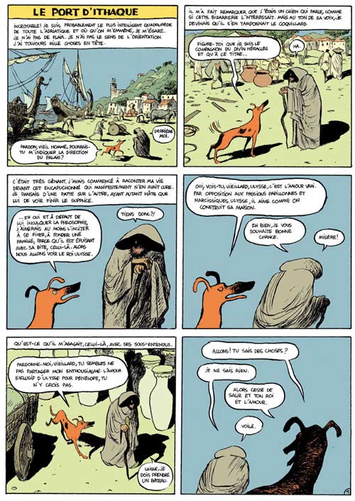 Dans cette série, Joann Sfar s’amuse comme un petit fou à maltraiter la philo et la mythologie grecque. Le résultat est jubilatoire, avec une bonne dose d’irrévérence, option mort de rire (Ulysse découvre son homosexualité dans les bras d’Herakles, qui s’en défend). Bref, on passe ici un bon moment tout en lisant une BD intelligente. Le dessin de Christophe Blain et les couleurs d’Audré Jarel sont minimalistes mais suffisent amplement à nous faire apprécier les nombreuses réflexions franchement drôles. Sur un découpage de 6 cases par planches, à une ou deux exceptions près, ces auteurs qui se connaissent très bien (ils ont déjà réalisés 3 tomes de Donjon Potron-Minet ensemble) poursuivent leur délire philosophico-humoristique. Comme sur le premier tome, la trame du récit s’appuie la plupart du temps sur les pensées en voix off de Socrate. Ce système permet d’enchaîner les péripéties philosophico-guerrières. Certes, il y a bien quelques clichés (les « vrais » hommes sont des machos, les Grecs sont des pédés). Mais c’est au service d’un humour libre, fin, impertinent, comme Sfar l’apprécie et comme on l’apprécie chez lui. En même temps, ce dernier ne produit pas du Platon et la BD se lit assez vite. Si les réflexions de Socrate empruntent un ton résolument libre, Sfar sait également lui accorder quelques proses plus littéraires. Cette série reste donc très accessible au public – en dehors de toute considération morale…