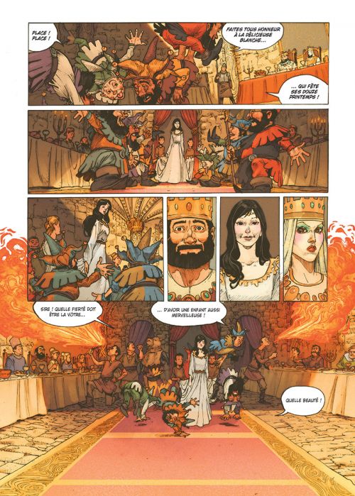 C’est jour de liesse au château : on fête l’anniversaire de Blanche, la jeune et splendide fille du roi. La fille « illégitime » du roi, précise la reine, emplie d’amertume. Car Blanche est le fruit des amours de son mari avec une simple courtisane. La fête est égayée par les pirouettes des sept nains bouffons, qui débitent des sottises à longueur de banquet. Un bon mot, pourtant, contribue à pousser le courroux de la reine au-delà du supportable. En rage, elle exige leur décapitation. Le roi tempère en choisissant plutôt le bannissement. Les nains sont donc proprement jetés en dehors de l’enceinte du château. Mais en douce, le roi leur fait passer un message : rendez-vous le soir-même à l’auberge du Joyeux-Poney, pour essayer d’arranger cette sanction exigée par sa sadique épouse. Hélas, le roi ne viendra jamais à l’auberge. D’ailleurs, de ce jour, personne ne le reverra jamais. Six ans plus tard, les choses ont bien changé. La reine règne en despote sur le royaume. Blanche en est réduite à faire le ménage. Depuis leur isolement en forêt, les nains tentent désespérément de tirer quelque minerai de leur mine d’étain… en vain. Jusqu’à un crucial coup de pioche, qui met à jour une galerie aménagée. En suivant le dédale jusqu’à son bout, ils s’aperçoivent qu’il s’agit d’un accès souterrain secret vers le château. Le labyrinthe se poursuit par endroits dans les doubles cloisons de la forteresse, avec des regards dissimulés sur moult pièces. Après réflexion, le plus savant des nains déduit qu’un endroit précis se trouve juste à côté de la salle du trésor… Le voilà leur filon ! Cependant, il s’agit de creuser sans bruit, donc lentement. Le plus benêt des nains poursuit quant à lui son exploration du labyrinthe en solo. Il se retrouve par hasard derrière un miroir sans fond, dans la chambre de la reine, au moment pile où elle se pâme…