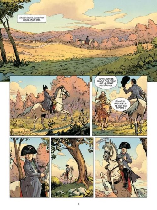 Sous les talentueux crayons réalistes d’Ivan Gil, dessinateur espagnol passionné et spécialisé dans le 1er Empire français, Rudi Miel et Fabienne Pigière continuent de raconter les derniers mois de Napoléon 1er, alors qu’il était prisonnier des anglais sur l’île de Sainte Hélène. Qu’y faisait-il ? Cherchait-il vraiment à s’évader ? Quelles étaient ses relations avec son geôlier ? Ses conditions de vie étaient relativement dorées pour un prisonnier… bien que l’austérité de cet îlot volcanique et sa distance avec le continent africain (à 2000km des côtes de la Namibie) faisaient de cette résidence pénitentiaire de luxe une réelle prison. Les scénaristes imaginent les relations très tendues mais respectueuses entre Bonaparte et Lowe, le premier cherchant à manipuler le second – son ultime petit plaisir politique et mesquin. Ils imaginent que Lowe cherchait à comprendre l’origine du trésor de Bonaparte, sans doute celui d’Alexandre le Grand ; et que Bonaparte essayait obstinément de trouver un moyen de s’évader. Ce qui donne lieu à quelques séquences rocambolesques ; et à de nombreux flashbacks lors de la campagne d’Egypte. Malgré ces écarts fantasmés vis-à-vis de la réalité, les auteurs s’appuient sur des témoignages historiques solides : les derniers jours de l’ex-Empereur ont bien été documentés. D’ailleurs, chaque volume de la série se termine par un cahier spécial revenant ses les mots et les faits de cette période d’incarcération de 6 ans. Napoléon mourut à Saint Hélène en 2021 sans avoir jamais pu revoir l’Europe.