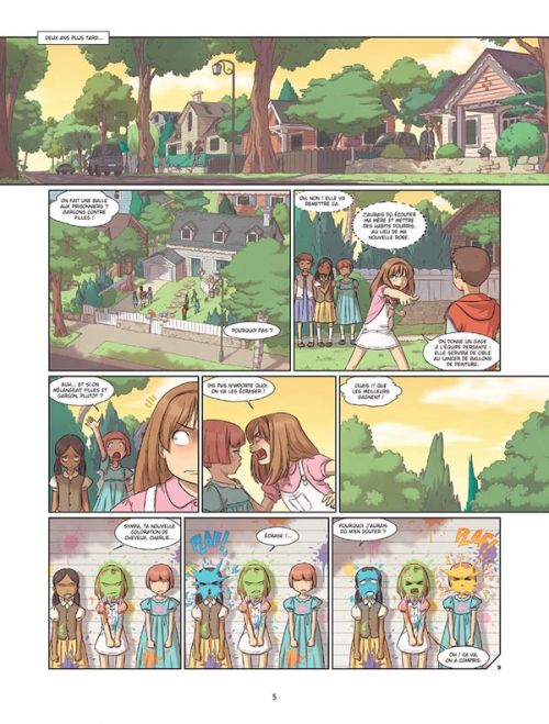 Tout en assurant le dessin des Premières missions de la Rose écarlate, Jenny a développé cette nouvelle histoire sentimentalo-sociale très manga-typée en tant qu’auteure complète, de nouveau dans un format 46CC (46 pages cartonnées couleurs), typique franco-belge. Le pitch va immédiatement happer son public-cible (plutôt féminin, de 11 à 18 ans) : suite à un pari débile, une nana doit se faire passer pour un mec durant une année entière de fac. Mission impossible ? C’est ce que nous verrons, à mesure des situations délicates rencontrées au sein d’un internat de garçons (évidemment), dans un registre proche du Vaudeville pour djeunz. La problématique des douches est un classique, la drague par une fille super sexy en est un autre… Et l’héroïne Charlotte – inévitablement rebaptisée Charlie – est forcée de mettre un allié dans la confidence, qui nourrit un mystérieux dessein. L’ensemble est très agréablement illustré, avec force détails et expressivité, quelques tronches super-deformed (sans en abuser) en prime. Deux scènes un chouya déshabillées (la douche, puis la soirée alcoolisée) feront trépider les plus jeunes… mais elles restent parfaitement chastes et donc astucieuses. Le découpage fluide et la colorisation de Pop, plus sobre que les séries estampillées Lyfoung, finiront même de convaincre les parents qui se seront laissé piéger.