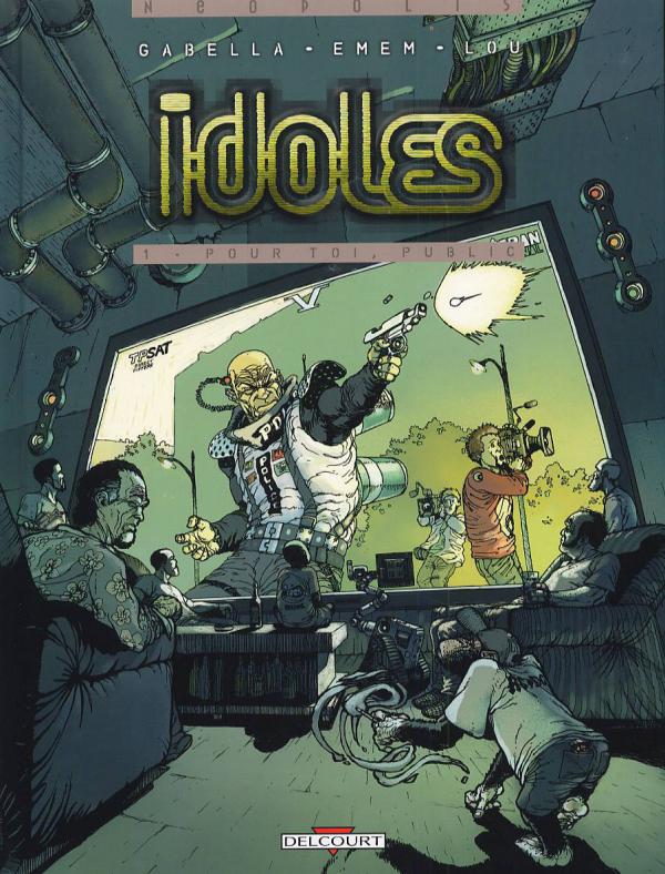 Episode pilote de la nouvelle série Idoles, Pour toi, public (titre digne d’une réplique de Frank Dubosc) est directement inspiré des super héros américains. Mais l’image du super héros est ici rattachée à la réalité dans une version « idole fasciste » bien moins naïve que celle que nous ont servis les comics durant des années. Inspiré par quelques récents faits de société, Matthieu Gabella scénarise ce premier tome autour de trois thèmes clés récurrents du thriller d’anticipation : les potentiels de la génétique, la télé-réalité poussée à son paroxysme et l’ « ultra sécuritarisme ». Toutefois, la narration n’est pas encore très bien structurée et ce premier tome sert un peu de fourre-tout pour des idées qui restent diablement intéressantes. Il en ressort une vision d’un futur des plus cyniques et pessimistes, qui ne s’encombrerait pas des questions d’éthique. Le graphisme d’Emem, également petit nouveau dans le milieu de la BD, est étonnement mature pour une première œuvre. Et pourtant son trait réaliste, détaillé et dynamique n’est pas mis en valeur par la colorisation un peu fade de Lou, qui convient néanmoins parfaitement à cet avenir morose. Quelques séquences à couper le souffle laisse présager le meilleur pour les épisodes à venir…