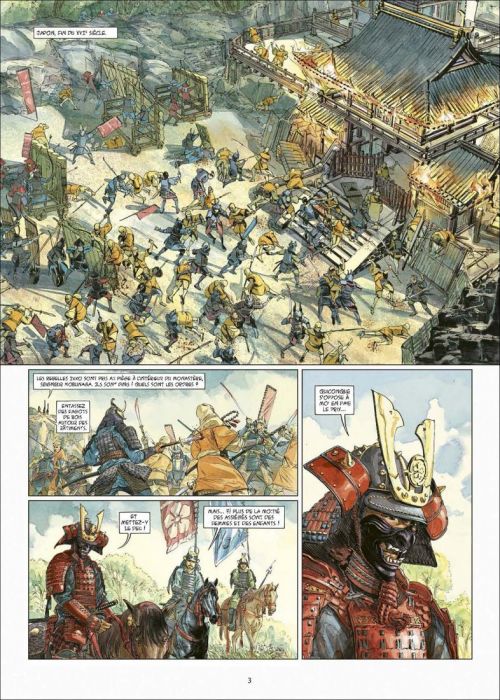D’après les sources de Wikipédia, nous ne connaissons que peu de chose sur la vie de cet esclave noir ayant existé et devenu samouraï au japon. Doté d’une grande taille, il impressionna tout un peuple, tant par sa force, sa couleur de peau que par ses facultés à apprendre les coutumes et la langue du pays. Autant dire une excellente base pour un récit épique et historique, mêlant le vrai à la fiction. Et dans l’exercice, Thierry Gloris, spécialiste de l’univers médiéval fantastique, nous gratifie d’un scénario bien ficelé et découpé, avec ce qu’il faut de coutumes japonaises, de combats au sabre, mais aussi de flashbacks et d’intrigues royales. Le dessin d’Emiliano Zarcone, léché, se marie quant à lui particulièrement bien avec l’histoire. Les couleurs sont vives sans être trop criardes et les personnages, Yusake en tête, offrent beaucoup de charisme. Les détails des tenues, pagodes et autres armures devraient ravir tous les passionnés de l’univers japonais, avec des décors typiques et même quelques dialogues en écritures japonaises traduite, qui permettent de s’immerger un peu plus dans l’univers de cet homme devenu hôte d’un pays et d’une culture, tout à l’opposé de ses racines. Reste que si ce premier tome nous décrit parfaitement l’univers japonais du XVIème siècle, en nous plongeant dans l’histoire de ses guerres de pouvoirs, l’histoire de notre héros y est assez courte, juste le temps de comprendre son parcours et d’entrevoir son long apprentissage. Heureusement, la fin de l’album nous permet d’envisager déjà la suite, forcément plus conséquente, de Yasuke, devenu samouraï et qui devrait enfin livrer quelques combats, autrement que pour le folklore local.