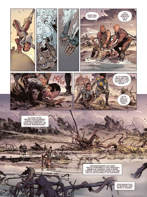 Eric Henninot continue son adaptation du roman SF à succès d’Alain Damasio. Sur une planète au climat hostile, la 34ème horde perpétue un rite ancestral et poursuit son chemin vers l’extrême amont. Elle cherche à déterminer l’origine du vent et le dompter. Dans ce 3ème volume, les paysages désertiques fouettés par les alizés laissent place à des marécages brumeux et des étendues d’eau rincées par les pluies. N’avançant pas tous au même rythme pour différentes raisons, le groupe d’aventuriers qui a déjà perdu de précieux éléments, va se scinder pour réaliser ce qu’aucune horde n’a jamais réussi jusqu’à présent : traverser la flaque. Evidemment, les nerfs et les organismes vont être mis à rude épreuve, ce qui va générer beaucoup de tensions et de peurs. Avec la mort de Piètro, Sov le scribe va endosser le rôle de fédérateur et de protecteur des plus vulnérables face à un Golgoth intransigeant. La psychologie des personnages évolue et rend le récit dense et riche. Si globalement cette quête sans fin nous tient en haleine, il faut reconnaître que certains passages ne sont pas des plus limpides, comme la visite de Te Jerkka et son combat contre un polychrone. Le dessin d’Eric Henninot arrive à nous emporter dans cet univers tumultueux, humide, rude avec une atmosphère éprouvante et pesante. Les amateurs de son trait pourront notamment privilégier la version en noir et blanc dans un format plus grand et agrémenté de quelques croquis en fin d’album.