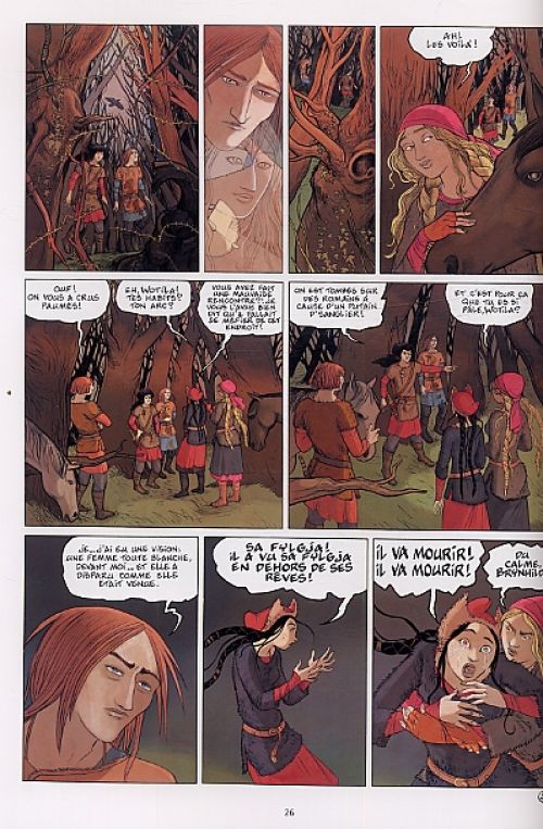 La collection Histoire et histoires de Delcourt s’enrichit d’une nouvelle saga pétrie de rigueur historique, pour nous éclairer sur une période relativement floue de l’Histoire européenne : les « invasions barbares » qui érodèrent l’empire romain à partir du Ve siècle. Bizarrement, cette époque charnière où l’antiquité a laissé place au moyen-âge a rarement été traitée en BD. Heureusement, quelques explications didactiques (en préambule, puis lors d’un glossaire annexe) nous immiscent dans le contexte. Cette longue phase de déliquescence se focalise ici sur la période où wisigoths et romains devaient cohabiter dans le sud-ouest de la Gaule, au travers d’un « partenariat win-win » (l’occupation gracieuse contre la protection). Le récit scénarisé par Hervé Pauvert met en scène un jeune héros tiraillé entre les deux civilisations : Wotila, adolescent wisigoth, est en effet né romain sous le nom de Lucius. Entre palabres politiques, croyances religieuses ou païennes, il apprend ses origines dans la douleur, supporte d’inquiétantes visions, vit le début d’une idylle et participe à des rites ancestraux (encore en vigueur aujourd’hui : le carnvalos, ancêtre du carnaval). Ce destin, à suivre dans un tome 2 déjà annoncé pour 2012, est mis en images par Cécile Chicault, qui se lance ici dans un projet autrement plus costaud que sa gentille Zélie, petite sorcière pour enfants. Son style graphique peine à convaincre lors des séquences d’action, légèrement figées, ou lorsqu’il troque les arrière-plans pour un simple aplat de couleur (la planche 31). Néanmoins, son trait fin et particulièrement soigné, complété par une colorisation impeccable, colle assez bien aux représentations de l’époque, bien avant l’« invention » de la profondeur de champ (à la Renaissance). La mise en bouche sérieuse de cette saga peinera peut-être à séduire, initialement, mais elle mérite assurément le détour en raison de ses grandes qualités historiques…