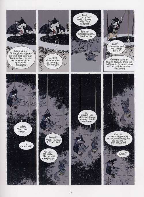 Affamé, Renart erre nuitamment autour d’un monastère. Là où il y a des moines, il y a à manger. Il pénètre par une brèche, se faufile dans le poulailler, tord le cou à trois poulettes et s’en repait de deux sur place. Se réservant la troisième pour plus tard, il file ensuite vers le puits, car manger donne soif. Le rebord est gelé, il glisse et tombe au fond ! C’est alors que le loup Ysengrin suit la même logique stomacale. Il pénètre dans l’abbaye, trouve la poule abandonnée de Renart, l’avale et se trouve assoiffé. Or, en se penchant au-dessus du puits, il découvre Renart se baignant au fond. Ce dernier se méfie du retour de bâton d’Ysengrin, car il a abusé des mauvais tours à son encontre. Il ruse donc une nouvelle fois, et lui annonce qu’il est mort et que le fond du puits est un lieu de délices. Il daigne toutefois le partager, si Ysengrin y descend sur le seau attaché à la corde…