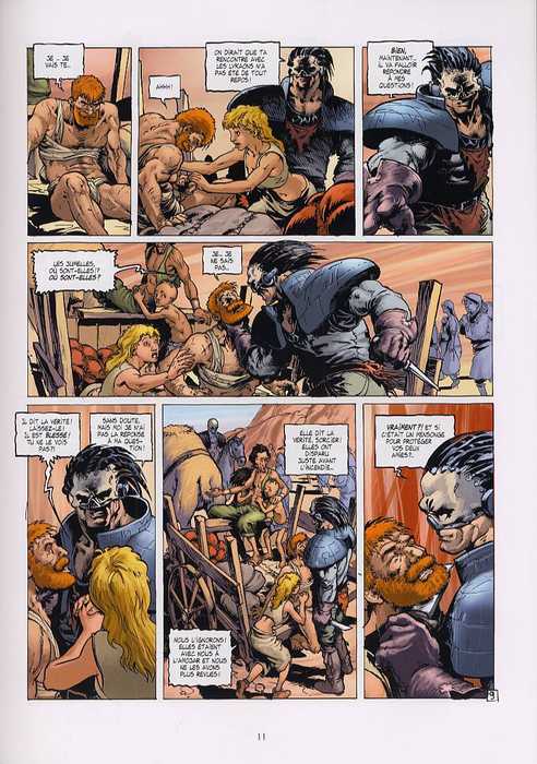 Les sorciers de Tichit, dont on disait les pouvoirs venus d’outre-tombe, et qui imposaient jusqu’alors un effroyable respect, ne sont finalement pas si terribles que ça. Non seulement ils sont d’une morne mortalité, puisqu’ils tombent les uns après les autres, mais en plus, ils se mettent à faire du paternalisme et veulent aider une civilisation décadente à se restructurer. Ça n’est pas cohérent. Le rôle de Moudj, qui focalisait à lui seul la droiture et le courage (le héros, quoi), est totalement ignoré avant de renaître, après un moment de flottement, pour le sursaut final… Il était grand temps que la série s’arrête. Le scénario de Dieter conclue ce cinquième tome bourré d’incohérences avec un happy-end gentillet et hyper conventionnel. C’est tellement dommage ! Même Etienne Le Roux dessine un ton en dessous de son talent réel. Il pâtit en plus d’une colorisation informatique sans relief qui ne valorise guère son trait. Seules les planches de la légende s’intercalant comme à l’accoutumé dans le récit, ressortent sur un mode graphique différent. Cette fois-ci, elles sont dessinées par Etienne Le Roux lui-même, qui parvient à trouver un compromis final entre ce style pictural et le « flux » de sa trame générale.