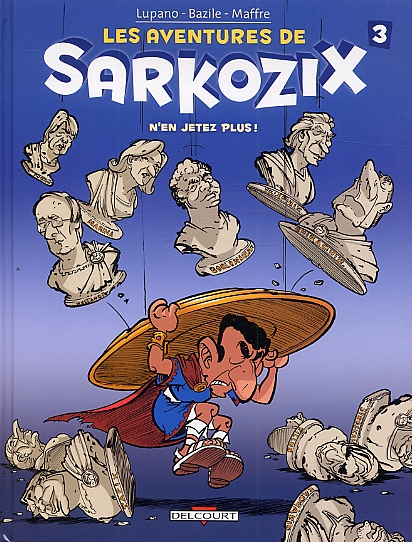 Titre ô combien contradictoire que celui qui dit N’en jetez plus… et qui propose néanmoins de rajouter une grosse louche de 31 gags pamphlétaires et parodiques. Mais après tout, puisque l’excès de caricatures n’est officiellement pas un problème, autant ne pas se priver. D’après une idée originale futée (de Guy Delcourt himself) et des ressorts comiques consensuels (parfois faciles), le concept de cette série d’humour politique perdure. Les auteurs font bien d’en profiter, car l’inspiration devrait naturellement se tarir en avril 2012 (sauf si…). Il s’agit évidemment d’appliquer le mandat présidentiel tumultueux de Nicolas Sarkozy au décorum et à la tonalité des aventures d’Asterix et d’Obélix. Au scénario, Wilfried Lupano appuie donc là où ça fait mal : les penchants populistes, le siphonage des voix du FN, la gabegie d’argent public, le mépris pour le petit-peuple… Les gags adoptent cette fois clairement un ordre chronologique en collant à l’actualité riche de la fin 2010 et du premier semestre 2011 : la réforme des retraites, la neige qui bloque Lutèce, la révolution à Carthage, le remaniement des préfets des Gaules, la guerre à grand renfort de catapultes contre l’infâme Khadafis, la « représidentialisation »… Au dessin, Bruno Bazile « fait le job » de manière pro et académique. Le style humoristique est parfaitement adapté au ton, mais il manque de percutant sur les caricatures des protagonistes (Liliane de Bethencourt et Marine le Pen sont franchement loupées).