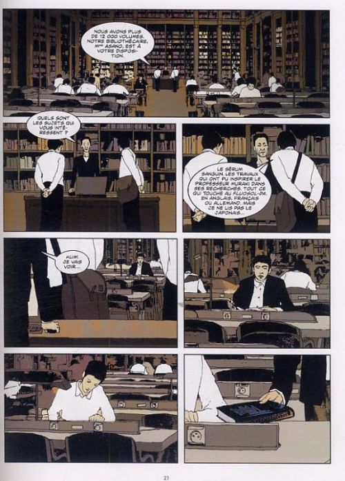 Abordant un thème original en BD – les crimes de guerre japonais liés aux expérimentations d’armes bactériologiques sur des cobayes humains en Mandchourie pendant la Seconde Guerre mondiale – Romain Slocombe et Freddy Martin n’ont pas choisi la facilité avec ce thriller sous haute tension. Car le sujet est trash, parfois glauque et souvent sombre. Utilisant un canevas narratif fait d’allers-retours entre scènes de guerre et présent étouffant, oscillant aussi entre cauchemars torturés et retour à la réalité, le scénariste touche-à-tout Romain Slocombe distille sobrement suspens et angoisse dans un monde peuplé d’individus étranges et inquiétants. Plus le récit avance, en fait, plus on flippe aux côtés des personnages, tant on les sent sur le point de basculer dans la folie. Pour les plus attentifs, il n’aura pas échappé que le scénariste s’amuse à multiplier les références à l’œuvre de Bram Stocker, Dracula, symbole de l’être immortel qui tue les vivants en leur prenant leur substance, le sang, leitmotiv de l’album ici. On pense bien sûr aux prénoms (Jonathan Harker et Mina Murray dans l’œuvre originale) ou au rapport à la science (Dracula était un brillant scientifique de son vivant, remplacé ici par Muraki). Malgré des petites touches de fantastique, la réalité de l’histoire est intensifiée par le dessin très photographique de Freddy Martin, à la fois glacial et épuré, tout à fait dans le ton. Voilà donc une mise en bouche intéressante pour un sujet pas évident. Même si ça en prend le chemin, on attendra toutefois le tome 2 avant de s’emballer réellement.