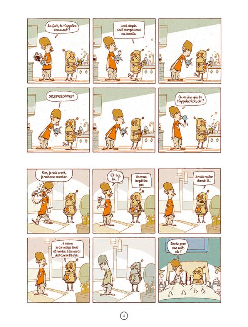 Démarré dans le journal Spirou bien avant la série Roger et ses humains, Rob propose le même principe de cohabitation entre un adulescent et un robot, mais en plus abouti, dans tous les secteurs ! Coté scénario déjà, les gags sont plus percutants, les histoires mieux construites et les sujets bien plus originaux et amusants. Ensuite, c’est également supérieur au niveau graphique avec des dessins plus détaillés, un meilleur découpage et une mise en page plus agréable. Ainsi, via des gags d’une demi-page (à l’exception de l’historiette en bonus de fin), le scénariste James nous offre un très bon divertissement, où la différence entre un humain plutôt tire-au-flanc et un robot quasi-parfait permet un large panel de sujets drolatiques. En effet, si Rob semble « l’esclave » idéal pour la vie quotidienne de Clunch, il apprend vite et évolue également. Que ce soit lorsqu’il arrive à mettre tous les appareils ménagers de son côté pour faire grève, ou encore lorsqu’il se montre supérieur à son maître pour travailler ou séduire une femme, le robot n’a pas fini de surprendre et de nous faire rire. En bref, le scénariste présente un duo parfait dans le registre de l’Auguste et du clown blanc. En prime, lorsque les deux compères sont bien en place, il étend efficacement l’univers. Boris Mirroir met adroitement les gags en images, de manière expressive. Dans un style mélangeant l’école franco-belge et l’école Tchô (le magazine de Glénat), le dessinateur joue parfaitement avec l’effet zygomatique. Bien que moins connus que le youtubeur Cyprien, les auteurs offrent une série bien plus réussie, dans un registre similaire…