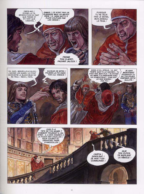 Une chose est sûre : l’histoire déjà débridée des Borgia n’avait sans doute pas besoin de la plume outrancière d'Allessandro Jodorowsky pour verser dans l’excès. Néanmoins, une fois encore, le scénariste ne fait pas dans la nuance pour narrer la sulfureuse épopée des Borgia, les « premiers parrains » de l’histoire, accusés entre autres de simonie, d’empoisonnement, d’inceste… Ah, le monde des Borgia, ce royaume enchanté peuplé de fourbes cupides, égoïstes et vaniteux, toujours ivres de pouvoir… Une petite mafia sympathique, quoi ! Pour montrer la déchéance des Borgia, le dessin de Manara est toujours aussi habile et impeccable : beau et profond, avec une succession de fresques décrivant une Italie décadente, le tout en couleurs directes. Très élégant. En revanche, le scénario manque franchement de consistance. Pourtant, moins de sexe incestueux et de stupre que dans les tomes précédents. Les scènes de torture, de sévices, de meurtre, d’égorgement et d’accouchement par césarienne viennent s’y substituer : toujours aussi violent et cruel. On aime bien Jodo, mais là, la surenchère sanguinaire virant à la complaisance et au plaisir sadique, conjuguée à une enfilade de scènes à la violence radicale, vient saturer l’esprit. Alors oui, les scènes sont magnifiques (celle du volcan, celle des oiseaux-volants), les répliques parfois amusantes et la mécanique narrative bien huilée. Mais les dialogues sont trop fades et l’outrance du scénario est à la fois l’atout et la limite de Jodorowsky. L’absence d’une trame narrative solide, profonde et subtile, entache l’ensemble. A mi-chemin entre la réussite esthétique et le ratage scénaristique, la série laissera finalement un goût d’inachevé, après des débuts prometteurs. Peut-être le tome de trop dans une série prévue à l’origine en triptyque. Pour prolonger le plaisir tout de même, lisez la suite non officielle, Le Pape Terrible, chez Delcourt. A moins que tout ne soit que vanité…