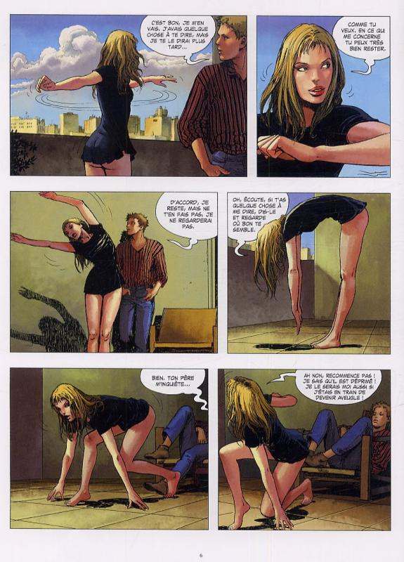 Le principe érotique du Déclic est un monument dans le vaste catalogue des fantasmes masculins. Pensez donc : avoir le pouvoir d’exciter une femme au-delà de la décence, d’un simple clic, c’est quand même bonnard ! (arrêtez deux secondes de cliquer, bon sang). Paru en noir et blanc il y a plus de 25 ans (1983), le premier tome du Déclic avait alors assuré la renommée de Milo Manara dans le registre de l’érotique chic (une notoriété qu’il complétera par la suite, notamment avec le Parfum de l’invisible). Etant donné que le stimulus sexuel de l’Homme est relativement stable et récurrent, il aurait été dommage de se priver de suites tablant sur exactement le même châssis… Or, en matière de châssis, Claudia Christiani est une recrue de choix : aristo, distinguée, presque pimbêche quand le curseur du boîtier de Fez est sur zéro, elle se transforme en pure bombe sexuelle dès qu’on lui titille la mollette. Et sous les crayons de Manara, elle exhibe des courbes affolantes, dans des positions et via des cadrages dont le caractère licencieux est généralement soudain… ce qui fait toute l’intérêt des différents opus de la série. Initialement publié en 1991 en noir et blanc, ce tome 4 ressort aujourd’hui en version couleurs… Certes, cela n’apporte pas grand-chose de plus, tout comme le scénario n’est qu’un prétexte pour amener notre héroïne à s’émoustiller dans des endroits incongrus. En effet, au climax de cet opus, Claudia se masturbe en plein milieu d’un couvent (Manara apprécie de mêler l’Eglise à la luxure : il a notamment dessiné les 3 tomes de Borgia…) et Angelina se sert de mini-caméras sphérique comme de boules de geisha (si vous ne savez pas ce que c’est, faites des recherches sur Internet, vous trouverez…). Le final (avec la servante enlevée) a beau être capilotracté et incompréhensible, bizarrement ce n’est pas vraiment ça qu’on retient de ce tome 4…
