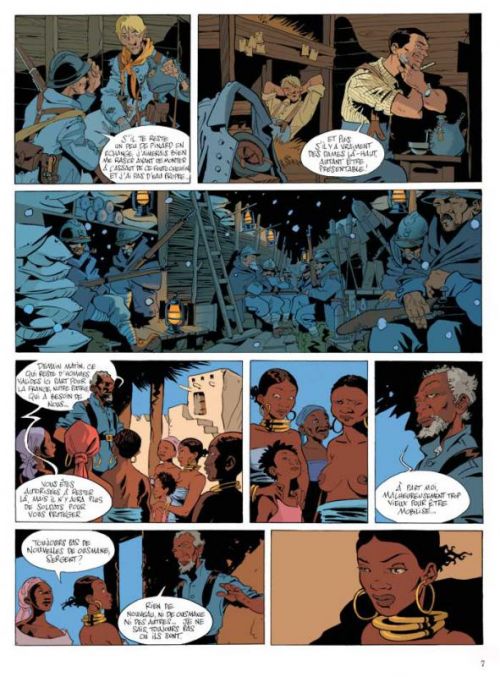 Avec le premier tome, on a vu grandir et évoluer alternativement Jean et Ousmane dans leur environnement respectif. Dans ce second volet, leurs trajectoires se rejoignent dans un contexte de première guerre mondiale, au milieu des champs de batailles. Le principe de l’alternance des histoires de chacun, de leur famille n’est plus équilibré, car c’est essentiellement le destin tragique de Jean Gadoix qui est traité dans ce second volume. On peut d’ailleurs regretter qu’Ousmane occupe désormais un second rôle. A travers cette histoire, c’est également le combat des femmes dans des périodes troubles que cherche à évoquer Lax : Hubertine, jeune femme émancipée, souhaite réhabiliter la mémoire de celui qu’elle a aimé ; Ismaïla, quant à elle, refuse les traditions tribales imposées aux femmes africaines. Le récit est fort, dense et montre que la guerre n’est pas qu’une histoire d’hommes. D’autres combats sont tout aussi difficiles à mener par les femmes. La disparition d’un des héros donne au récit une dimension encore plus tragique et profonde. Le dessin de Frédéric Blier est expressif, précis, d’une belle maîtrise, aussi bien pour les paysages chaleureux d’Afrique que pour l’univers boueux des tranchées. Les obsessionnels regretteront sûrement que la collection Aire Libre ait changé de maquette entre la parution de ces deux tomes, pour avoir des dos ronds uniformes dans leur bibliothèque…