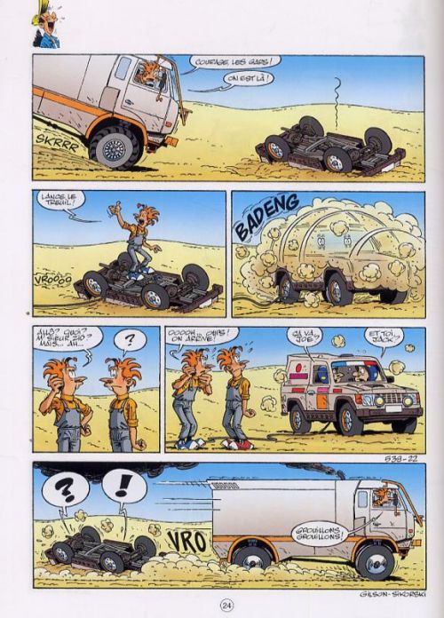 Après 13 albums passés dans l'univers des garages, le scénariste François Gilson (Mélusine, Les vétos...) change d'air et envoie Isidore au milieu du sable et de la pierre, pour un grand rallye. En effet, le garagiste en a marre du boulot, des clients et des bêtises de son apprenti. Il part donc en Afrique pour se changer les idées. Hélas, s'il se débarrasse facilement des deux premières contraintes, son apprenti le suit dans cette entreprise et se dédouble même avec un frère jumeau tout aussi stupide. L'idée du changement de décors est excellente : elle permet au scénariste de renouveler les gags, même si le thème de la voiture ensevelie revient tout de même très souvent. Néanmoins, les gags se montrent bien fichus et réussis, quoique variés dans leur efficacité. Via cette nouvelle mise en situation, Gilson met donc aussi en place le principe du fil rouge : une histoire complète en marge de l'humour habituel. Au dessin, Alain Sikorski (La clé du mystère, Tif et Tondu) livre un travail dynamique au niveau des expressions des personnages et des situations de gags. Les décors désertiques sont eux aussi soignés, et surtout diffèrents d'une histoire à l'autre. Le dessinateur ne cède donc pas à la facilité en reproduisant les mêmes éléments. Un album agréable, pour un bon moment de lecture...