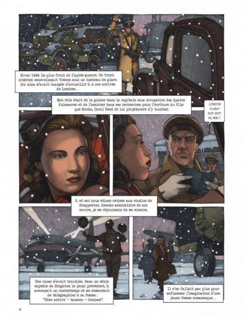 Vienne, Hiver 1948. Miss Elisabeth « Lizzy » Montagu accueille Graham Greene provenant de Londres, pour le compte de London Films d’Alexander Korda. Le rôle de la jeune femme est de le guider dans la capitale autrichienne sous occupation des quatre puissances : Royaume-Uni, France, États-Unis et Russie. Elle est tenue de l’assister pour l ‘écriture du film que Korda, Carol Reed et Greene souhaitent tourner. Elle l’accueille sur le tarmac de l’aéroport et le dépose à l’hôtel Sacher, où elle a déniché une chambre. Pour fêter son arrivée, Graham Greene sort une bouteille de scotch whisky et la partage avec Lizzy. Au Blaue bar, on commente l’arrivée de l’écrivain et on se félicite de sa venue dans une ville qui se meurt d’inculture, ravagée par les stigmates de la guerre. Le lendemain, Lizzy fait visiter la ville à Greene et notamment le cimetière Zentralfriedhof où reposent Beethoven et Salieri. La Tombe de Mozart est orpheline du corps du compositeur, enterré jadis en catimini au vieux cimetière Saint-Marx…