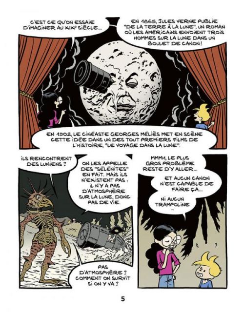 Nino est fier de sauter super haut sur son trampoline. Sa sœur Nina se moque de lui en lui conseillant de se méfier : il pourrait se retrouver sur la lune. Etant donné que cette question l’intéresse, elle explique que 12 hommes y sont vraiment allés et en sont revenus. Cette idée d’explorer notre plus proche satellite est logiquement venue dès lors que l’Homme eut terminé de cartographier notre Terre, au XIXème siècle. Mais aller sur la lune, c’est super difficile : il faut assez de force pour sortir de l’atmosphère, puis de l’attraction de notre planète. En 1865, Jules Vernes imagine dans son roman De la Terre à la Lune qu’un canon géant serait capable de faire cela. Et les premiers amateurs de cinéma l’ont vu grâce au film de Georges Mélies en 1902. Mais l’hypothèse du canon est bien plus improbable que celle des fusées. C’est grâce aux missiles V2 inventés durant la seconde guerre mondiale que cette idée devient possible. Les russes et les américains capturent alors les scientifiques allemands, comme Vernher von Braun, pour les pousser à inventer ces supers fusées. Une grande concurrence entre ces deux nations s’établit autour de l’idée d’être le premier à poser un pied sur la lune…