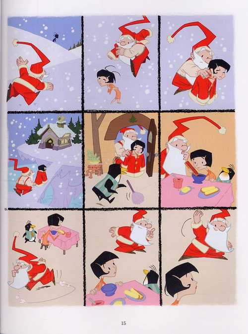 Ça y est, c’est déjà le 24 décembre ! Dans sa maison du pôle nord, le Père Noël se prépare à faire sa tournée. Brossage de dents, un peu de parfum, un petit tour au popot, il met le bonnet et file à l’usine de jouets, où les diablutins et Yéyé le yéti ont réussi leur tour de passe-passe habituel : fourrer des millions de jouets dans une seule minuscule hotte. Puis le Père Noël monte dans son traineau, lance ses rennes et multiplie ses arrêts sur nos toits. Or, dans une maison, se trouve Alice, un appareil photo à la main, bien décidée cette fois à piéger le Père Noël quand il sortira par sa cheminée. Soudain, le voilà qui débarque, descendant le long de sa corde par le conduit ! Alice se cache aussitôt derrière un fauteuil et profite que le père Noël a le dos tourné pour remonter par la corde. Puis elle se faufile dans le traineau, sous une couverture. Les rennes ont bien vu ce manège et tentent d’avertir le Père Noël. Mais celui-ci est trop fatigué pour capter : c’est la fin de la tournée, il est pressé de rentrer chez lui piquer un petit roupillon. Mais avant cela, il doit fêter ce nouveau Noël avec les diablutins qui lui ont préparé une grosse fiesta. Pendant ce temps, Alice sort discrètement du traineau et pénètre dans l’usine de jouets…