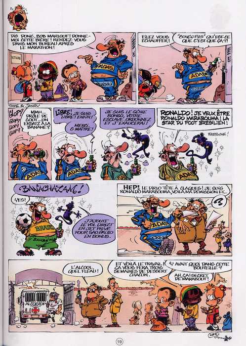 Mamie, l’abbé Langelusse (le curé), Monsieur Mégot (le prof de gym qui fume des clopes et boit de la bière) sont à l’honneur dans ce treizième recueil. Tout commence par une histoire longue (…de 6 pages : voir résumé ci-dessus), pour continuer par un empilement plus ordinaire de gags en 1 planche. Les fans apprécieront tout d’abord de retrouver le trait humoristique et débridé de Janry, toujours aussi fun et dynamique. Dans la lignée de l’école franco-belge de Franquin, l’artiste n’a pas son pareil pour dessiner des trognes pas possibles, surtout lorsque leurs propriétaires sont énervés ou estropiés. Côté scénar’, les sujets des gags lorgnent parfois sous la ceinture, sans jamais dépasser le stade de la friponnerie. Si cette impertinence en énervera plus d’un, ce n’est toutefois pas l’aspect le plus contrariant. En fait, cette fois, les idées des gags concoctés par Janry ont de plus en tendance à faire flop. Pas drôles ou pas percutantes, elles reposent la plupart du temps sur le traitement graphique (génial) de Janry. A côté d’un Titeuf (par Zep) ou d’un Kid Paddle (par Midam), qui disposent tous deux d’un sens du gag irrésistible, Le petit Spirou fait un peu pâle figure. Bien « installée » chez son public, parce que précurseur en la matière, la série s’essoufflerait-elle ?