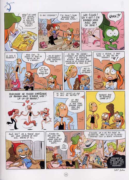 Les filles, planquez vos Jules : ces deux petites pestes de Nombrils reviennent, avec la même propension à transformer la gente masculine en zombie baveur, et à taper sur le système du sexe faible. Il faut reconnaître que les auteurs Delaf et Dubuc leur ont chargé la barque : insupportables, égocentriques, garces, futiles… Il y a de quoi virer sa cuti. Ici, rien de bien nouveau par rapport au précédent opus : la recette fonctionne plutôt bien, les idées de sketches sont loin d’être taries, autant exploiter le schéma jusqu’au bout. Graphiquement, le dessin est toujours moderne et stylisé, les couleurs sont acidulées : bref parfaitement dans le ton. Les petits plus de l’épisode : on découvre la famille de Vicky : père anglais, grande sœur rivale ; l’amour réciproque que se vouent Karine et Dan se consolide au fur et à mesure que les deux autres pestes leur font des crasses. Le petit moins : les ressorts comiques se placent dans la même veine qu’une multitude de BD humoristiques de gags en une planche, ici sur la thématique des ados nombrilistes. A noter, étant donné que les auteurs sont québécois, le décorum lycéen est plus proche de ce qu’on voit dans les téléfilms américains que de notre réalité franco-belge.
