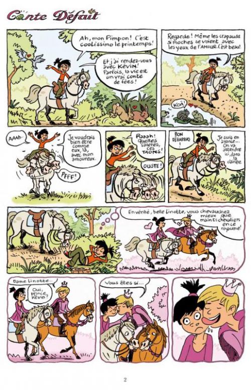 C'est le printemps ! Sur son poney Pimpon, la petite linotte attend son amoureux Kevin, car elle a rendez-vous avec lui pour une petite balade dans la nature. Profitant d'une sieste, elle se rêve en princesse et l'imagine en prince charmant... Lorsque soudain, le poney de Kevin la tire de ses songes d'un gros coup de langue sur la joue. La balade peut donc commencer. Mais elle est perturbée par des taons, voltigeant autour des chevaux. Ces insectes qui piquent fort s'en prennent à Kevin... qui est allergique ! Le joli prince abandonne donc illico la promenade pour filer prendre ses médicaments, avec une tête de crapaud toute boursouflée...