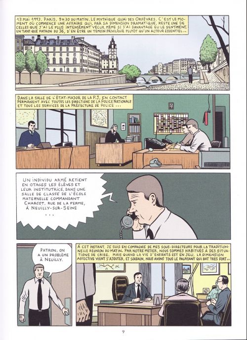 La prise d’otage de la maternelle de Neuilly, c’était il y a (déjà) 20 ans… Ce qui allait rester comme la plus célèbre prise d’otages de France plongeait le pays en émoi durant deux jours. Quand on s’en prend à des enfants, la tension est en effet décuplée. C’est par ce petit rappel que Claude Cancès, directeur de la PJ de l’époque, devenu co-scénariste pour l’occasion (épaulé par Alain Gillot et Pierre Dragon), introduit l’album. Par cette présentation, la série 36 Quai des Orfèvres précise aussi son intention : elle empilera des one-shots qui reviendront sur des grandes affaires criminelles, sans intention de broder. Les faits, rien que les faits, seront relatés, sur les évènements qui ont tenu l’opinion publique en haleine. Logiquement, la narration est la plupart du temps relayée par une voix off descriptive – procédé « facile », mais inhérent à la démarche. Complété par une colorisation fade, le dessin simple mais honnête de Léo Quiévreux se positionne à l’opposé de toute mise en scène spectaculaire. Malgré ses aspects disgracieux, il participe lui aussi, à dessein, de l’approche distante et quasi documentaire. La lecture de ce premier opus donne raison à ces partis-pris : cette manière de faire fonctionne pas mal. Même en se rappelant du dénouement, on est tenu en haleine par les détails de l’affaire. Comment les choses se sont organisées sur le terrain ; comment s’est établi un principe d’échanges « enfant contre sac de fric » ; comment la fatigue a tendu progressivement les acteurs ; et comment finalement le RAID a abattu l’homme sans autre effusion de sang. On est prêt à rempiler sur une prochaine affaire…