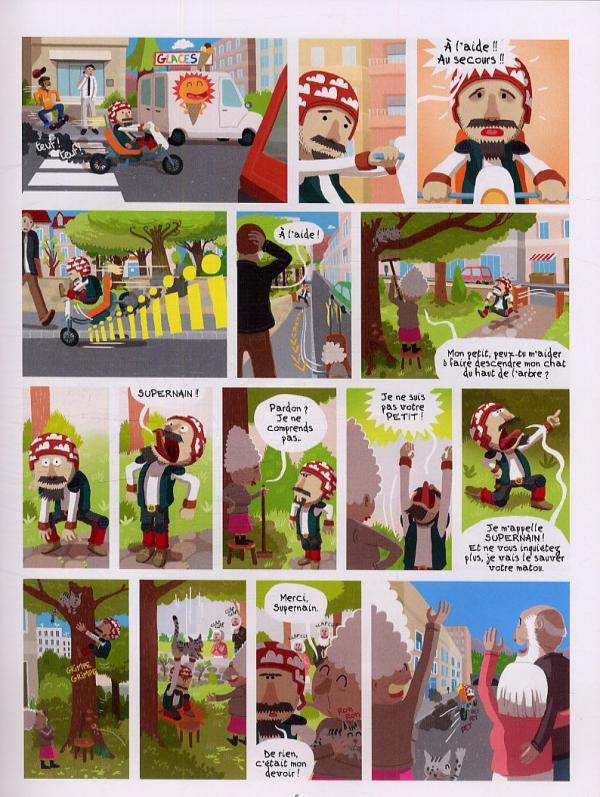 Supernain est un héros méconnu. Peu d’enfants le connaissent car ses aventures sont restées volontairement cachées. Il y a 2 ans pourtant, un beau jour, l’alarme sonnait dans le salon d’un petit homme occupé à tricoter. Immédiatement, délaissant son affaire, il saute de son canapé, écoute la météo – histoire de sortir couvert si nécessaire – et sort. Démarrant en trombe sa moto (qui laisse derrière elle un effroyable nuage noir), il arrive sous peu sur les lieux de l’action. La police est déjà là. Supernain apprend de la bouche d’un agent qu’il arrive trop tard : un certain Roger Super a déjà délivré tous les otages retenus par le Bouffon mauve ! C’est manqué pour cette fois. Sur le chemin du retour, Supernain sauve le petit chat d’une vielle dame coincé dans un arbre. Il y gagne de chaleureux remerciements. Mais, le lendemain, seul Roger Super fait la une des journaux. La carrière de Supernain débute mal. Mais elle ne fait que commencer…