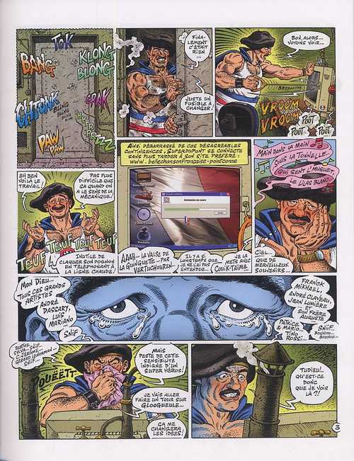 Il est toujours plaisant de retrouver un personnage bien connu qui s'était fait un peu oublié : six albums seulement depuis sa naissance en 1972. En ces temps où les super héros des comics de Marvel et autre DC connaissent une nouvelle jeunesse grâce au cinéma, Messieurs Gotlib, Lefred-Thouron et Solé ont l'excellente idée de ressortir de l'oubli l'illustre Superdupont. C'est qu'il est encore vert et moderne notre superhéros en charentaises (NF s'il vous plait, les chaussons). En ces temps de mondialisation, il va défendre les producteurs de camembert de pâles contrefaçons. Et c'est logiquement à Poitiers que ce Charles Martel des temps modernes arrête le flot de fromages made in Irakistan. Vous l'aurez compris sans peine cet album verse, comme de bien entendu, dans la caricature de nos travers franchouillards. La satyre est mordante et le trait (narratif) grossier. Via Superdupont, Gotlib et Lefred-Thouron nous renvoient à nos petitesses et défauts. Le pinceau de Solé donne vie à tout ce petit monde avec talent. Malheureusement, les ressorts de ces histoires se ressemblent et la répétition finit par nuire à l'ensemble. Un conseil, lisez un gag par jour et non pas dans la foulée, vous en apprécierez plus l'album.