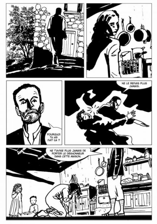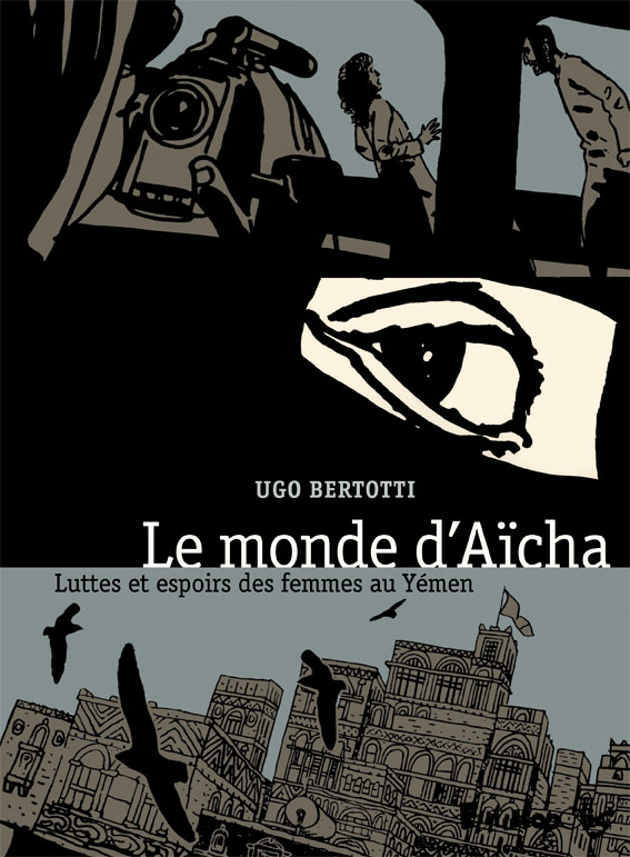 Le niqab. Il y a quelques années, en France, ce vêtement faisait l’objet d’un débat national, puis d’une loi d’interdiction dans les espaces publics. Au Yémen, ce pays qui a hurlé sa colère au moment des révolutions arabes puis s’est tu à nouveau, rares sont les femmes qui ne le portent pas. Lors d’une mission de son mari au Yémen, Agnès Montanari, photographe, marquée dès son arrivée par les silhouettes noires glissant dans la ville de Sanaa, s’introduit peu à peu, et à tâtons, dans les maison yéménites et y soulève le voile qui couvre le visage des femmes. Mais les hommes règnent en maîtres et effacent systématiquement une bonne partie de ses photographies. Frustrée de ne pouvoir partager toute son expérience et les histoires qui lui ont été racontées, elle contacte Ugo Bertotti afin que les dessins prennent le relais de ces images manquantes. La collaboration aboutit en premier lieu à l’article Femmes du Yémen dans le n°18 de la revue de reportages XXI, puis au Monde d’Aicha en 2013 en Italie. Les récits de toutes ces femmes y sont magnifiquement mis en scène par un graphisme très contrasté de blanc et noir, dont les aplats évoquent des ombres qui planent constamment, comme le niqab enveloppant le monde de ces femmes. Un monde porté par deux valeurs : la famille et la pudeur. On ne déshonore pas la famille et on ne provoque pas le désir des hommes autres que son mari. « Nous ne sommes rien, et quand même toujours scrutées par mille regards » constate Aicha. Car ces femmes, ou ces jeunes filles que l’on cache, sont jugées, punies, voire bannies pour des actes, ou simplement des situations qui dérogent à ces lois. Certaines le subissent, d’autres s’y opposent. Une oppression quoi qu’il en soit insupportable, dont il est plus qu’urgent de montrer le visage. Elles nous chuchotent leur intimité, écoutons.