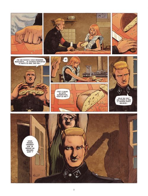 Jean-Charles Gaudin et Steven Lejeune construisent une série historique et familiale assez classique autour du thème du pain, qui va jouer un rôle tout particulier dans cette première intrigue prévue en deux tomes, avant un second volet qui clôturera la série. Autour de la petite boulangerie se construisent une série d'intrigues personnelles avec les habitants du village et les occupants, tandis que la guerre impose ses enjeux et fait émerger des comportements héroïques. Les choses avancent assez vite et il se passe déjà beaucoup de choses dans ce premier volume, qui s'ouvre sur la promesse d'une image assez gore : un rouleau à pâtisserie qui va s'abattre sur le crâne d'un officier allemand qui mange un morceau de pain. Les images tranquilles de la vie en province sont donc de courte durée, la violence de la guerre va venir marquer le quotidien du village d'apparence tranquille. Le ton général est celui d'une histoire grand-public, on n'est pas très surpris par les évènements, même si on se demande vraiment ce qui va se passer après la dernière case de ce premier volume. Le soldat allemand, lui, n'aura pas l'occasion de connaître la suite (ouille ça doit faire très très mal), mais ses copains vont forcément se rendre compte de quelque chose.